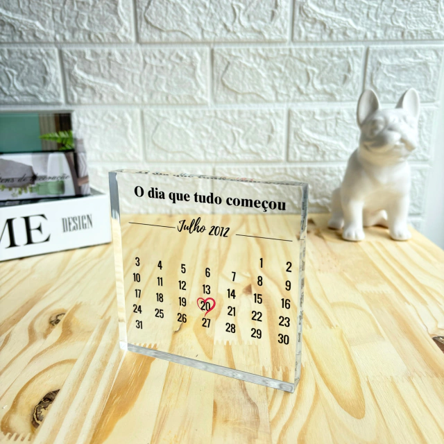 Este bloco de acrílico cristal é uma peça elegante e atemporal, perfeita para eternizar uma data especial. O calendário ilustrativo destaca a data escolhida, sem incluir dias da semana, resultando em uma lembrança sofisticada e personalizada.